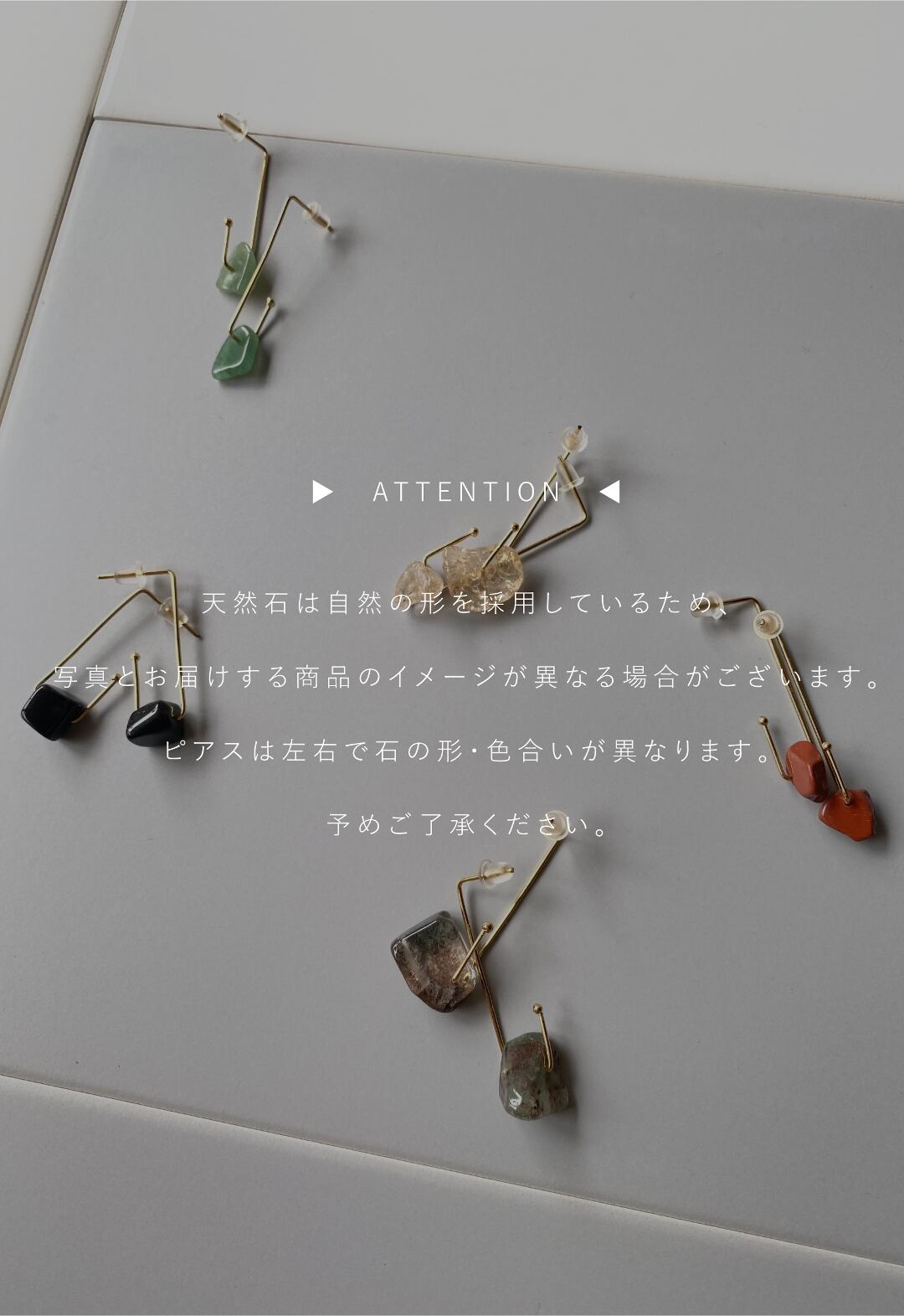 天然石は自然の形を採用しているため、写真とお届けする商品のイメージが異なる場合がございます。ピアスは左右で石の形・色合いが異なります。予めご了承ください。